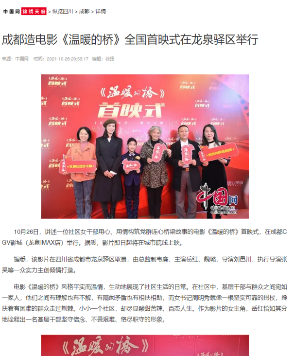 | 10 | “成都造”電影《溫暖的橋》首映 岳紅“化身”社區(qū)書記看哭觀眾 | https://e.chengdu.cn/html/2021-10/27/content_715203.htm | 成都商報 | 報紙 | 市媒 |